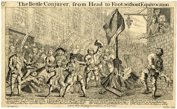 Therefore, there was little surprise when a large audience packed the Haymarket Theater on the evening of the 16th January 1749. They waited, and continued to wait for hours, all the while growing tired and restless. The theater manager, Samuel Foote, came out front and tried to calm the crowd. They were resistant, and began to demand their money back. There is some confusion as to what happened next. It is said that someone yelled that they would pay double if the conjuror would stuff himself into a pint bottle instead of the wine bottle as originally claimed.